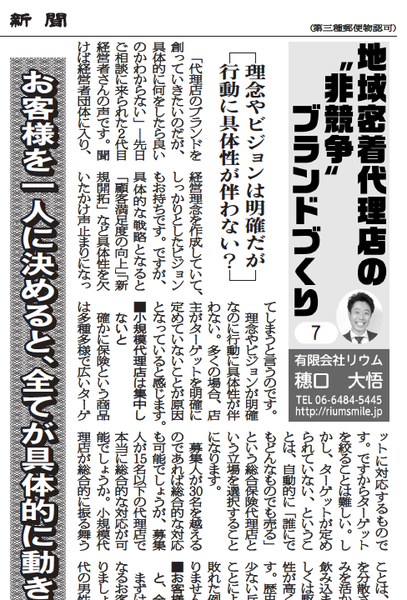 新日本保険新聞(損保版)に、穂口の連載「地域密着代理店の”非競争”ブランドづくり」の最新記事が掲載されました。