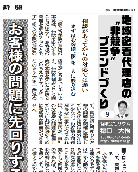 新日本保険新聞(損保版)に、穂口の連載「地域密着代理店の”非競争”ブランドづくり」の最新記事が掲載されました。